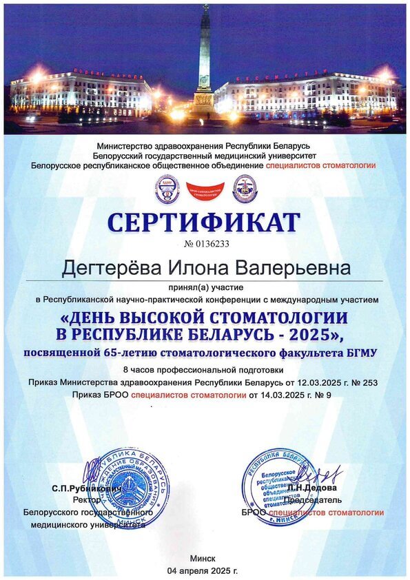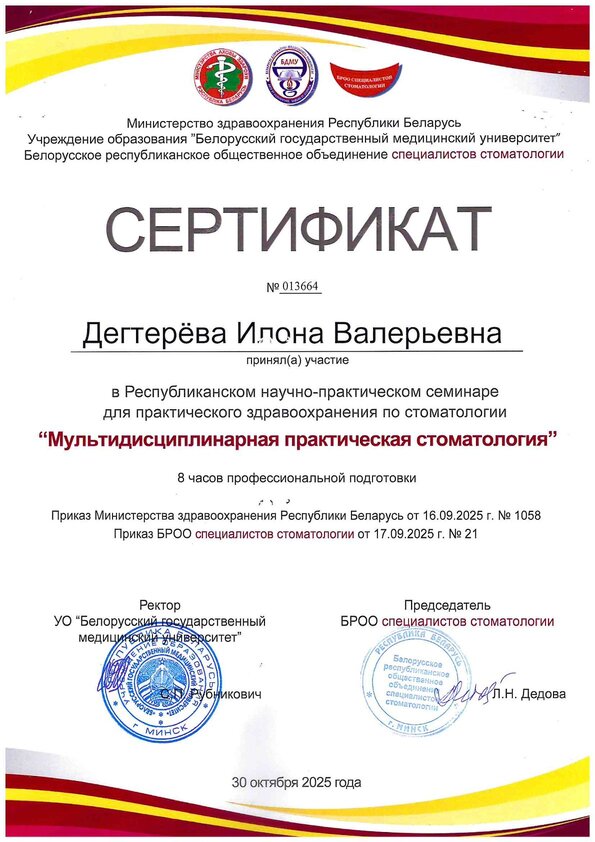 Прошла специализированную подготовку в клинической ординатуре на кафедре «Ортопедической стоматологии и ортодонтии с курсом детской стоматологии» БелМАПО по специальности «ортодонтия».