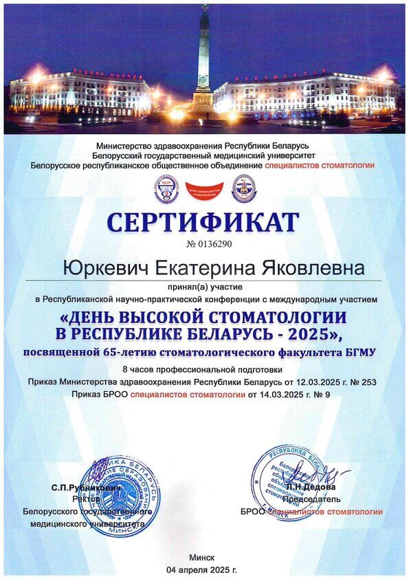 Профессионал в области ортодонтии. Прошла специализированную подготовку в течении двух лет в ординатуре Белорусского Государственного Университета по специальности Ортодонтия. С 2014 по 2017 годы обучалась в Школе Ортодонтии Ormco.